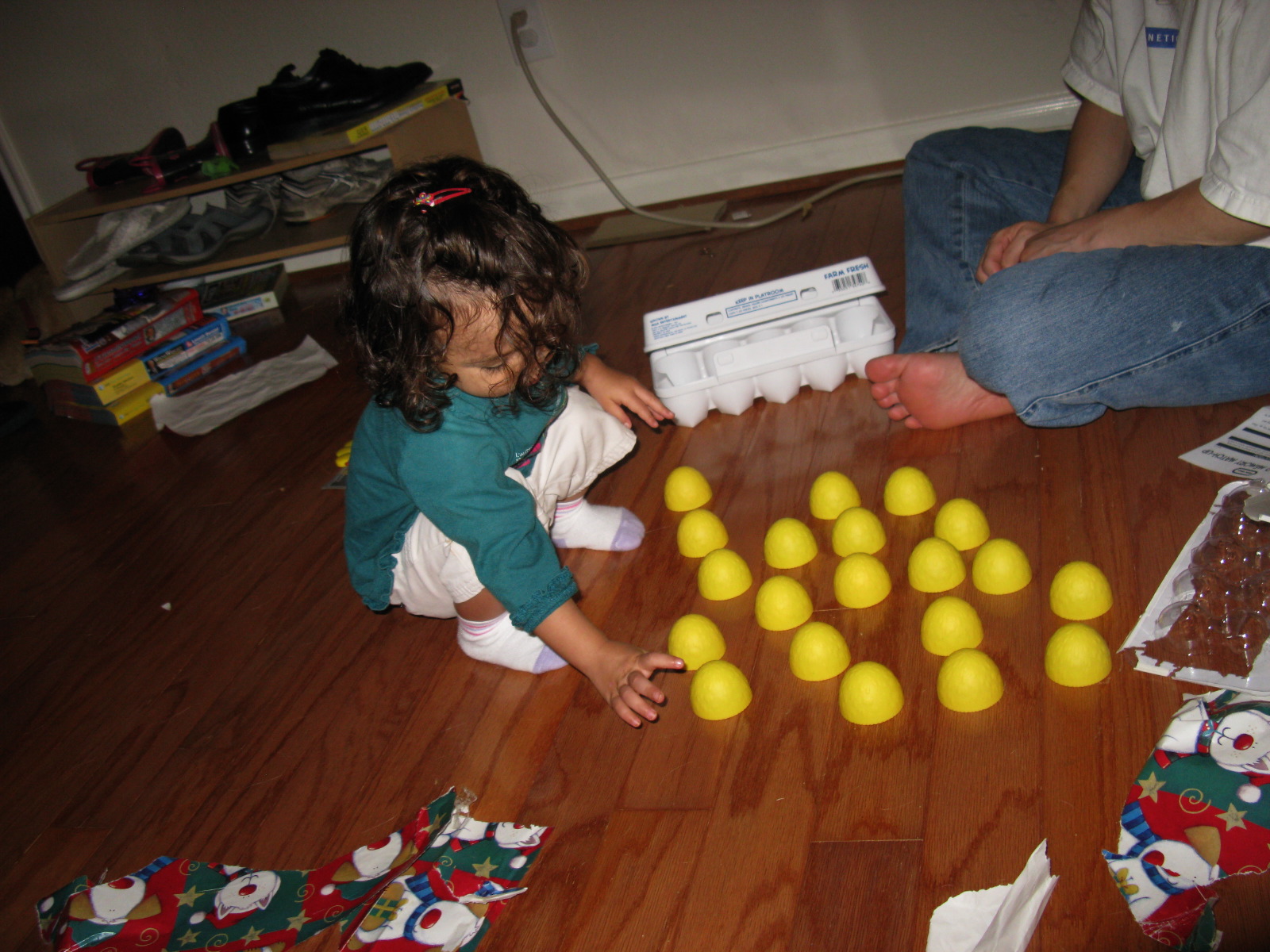 Dennis unwrapping Farm Fresh Egg game from the Brubakers