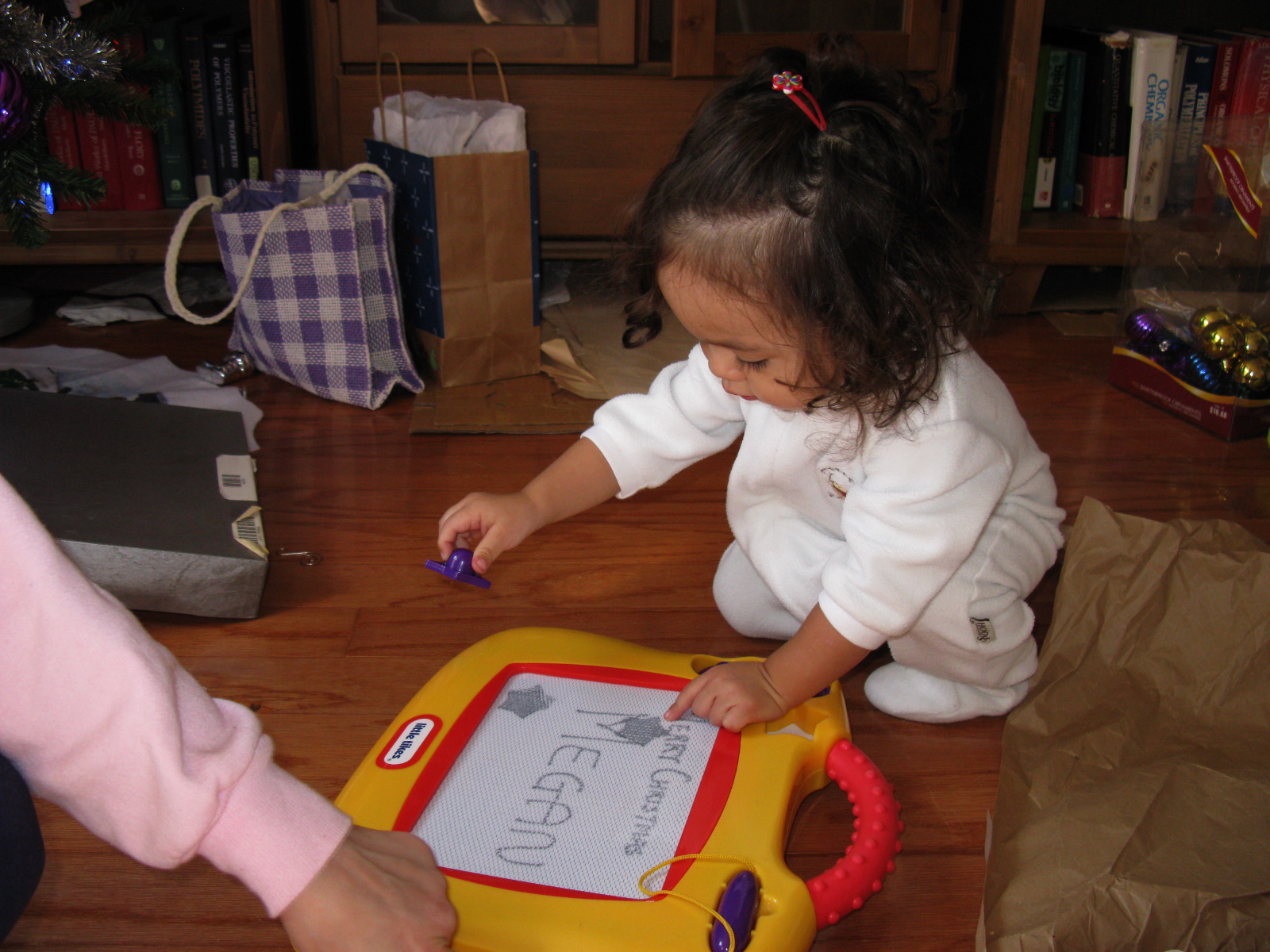 Dennis explores her Little Tikes Magnadoodle board
