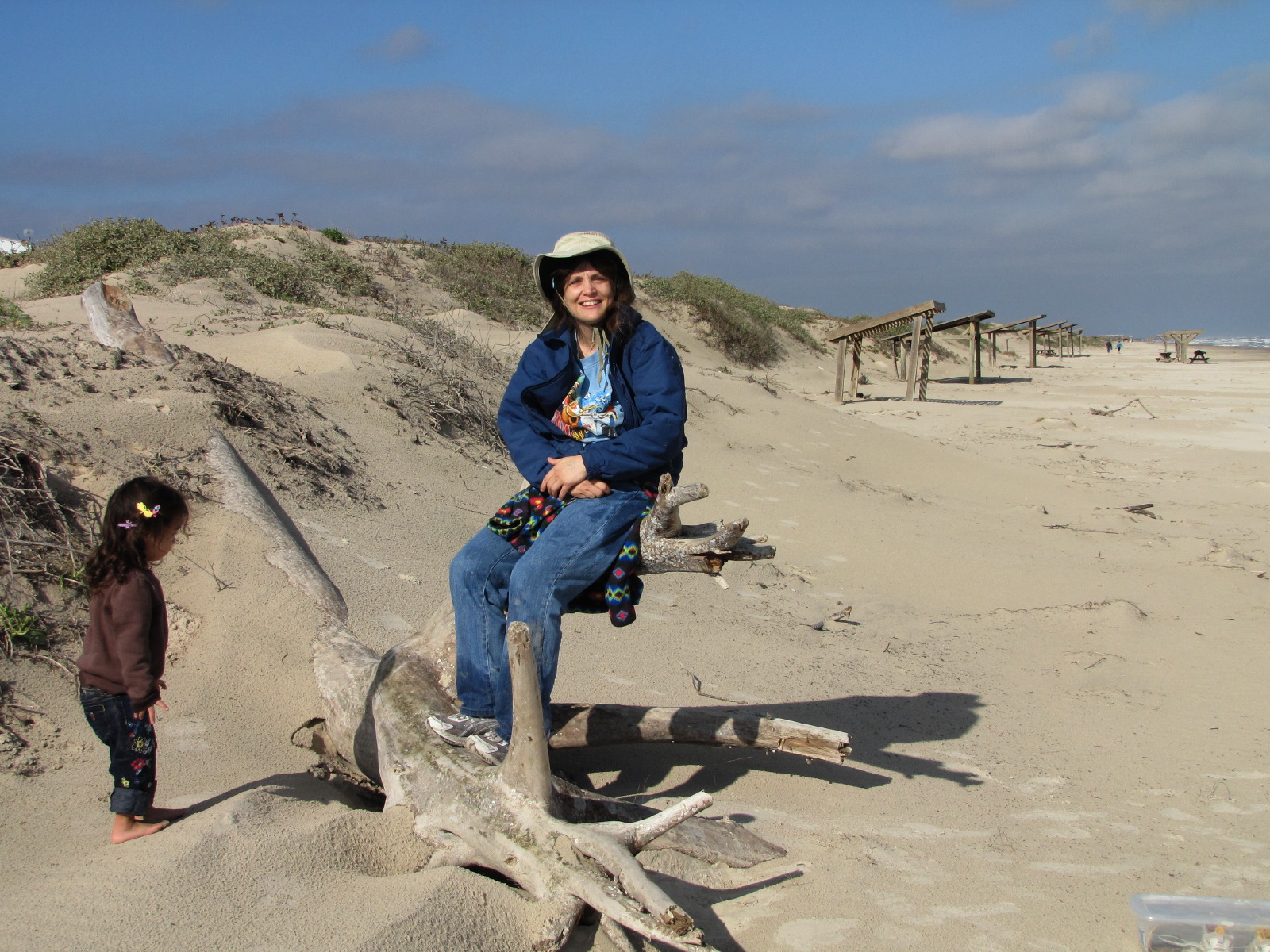 Sitting on driftwood, Malaquite Beach, Padre Island National Seashore