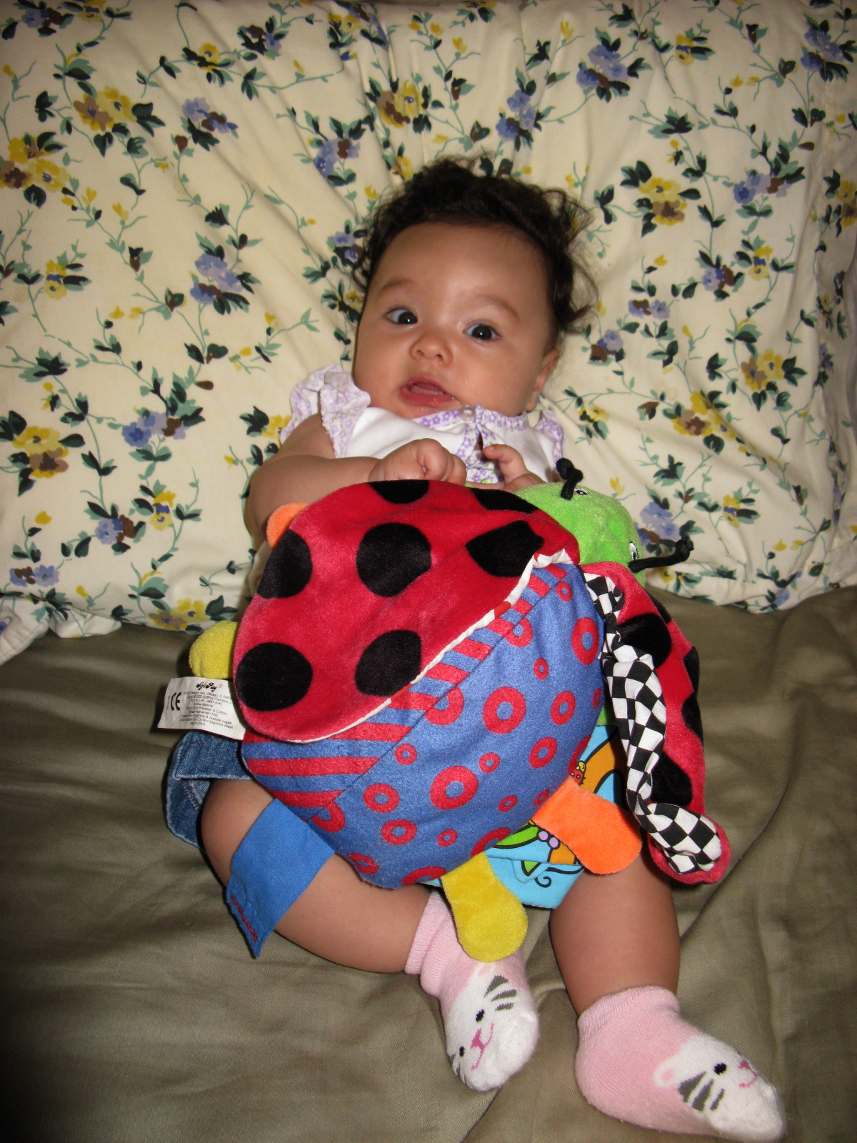 Dennis in her Butterfly shirt and jean short outfit with her Lamaze "Where is Caterpillar" Book