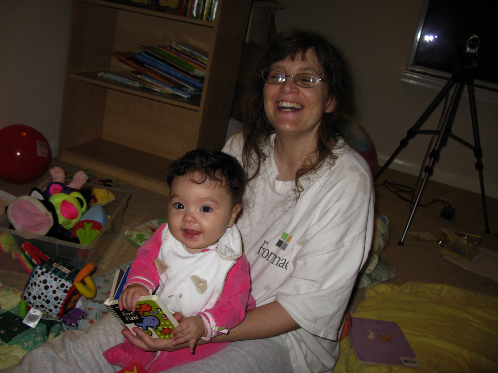 Dennis and Mommy reading Five Fish, Pink Baby Einstein sleep and play from Pedro and Martha