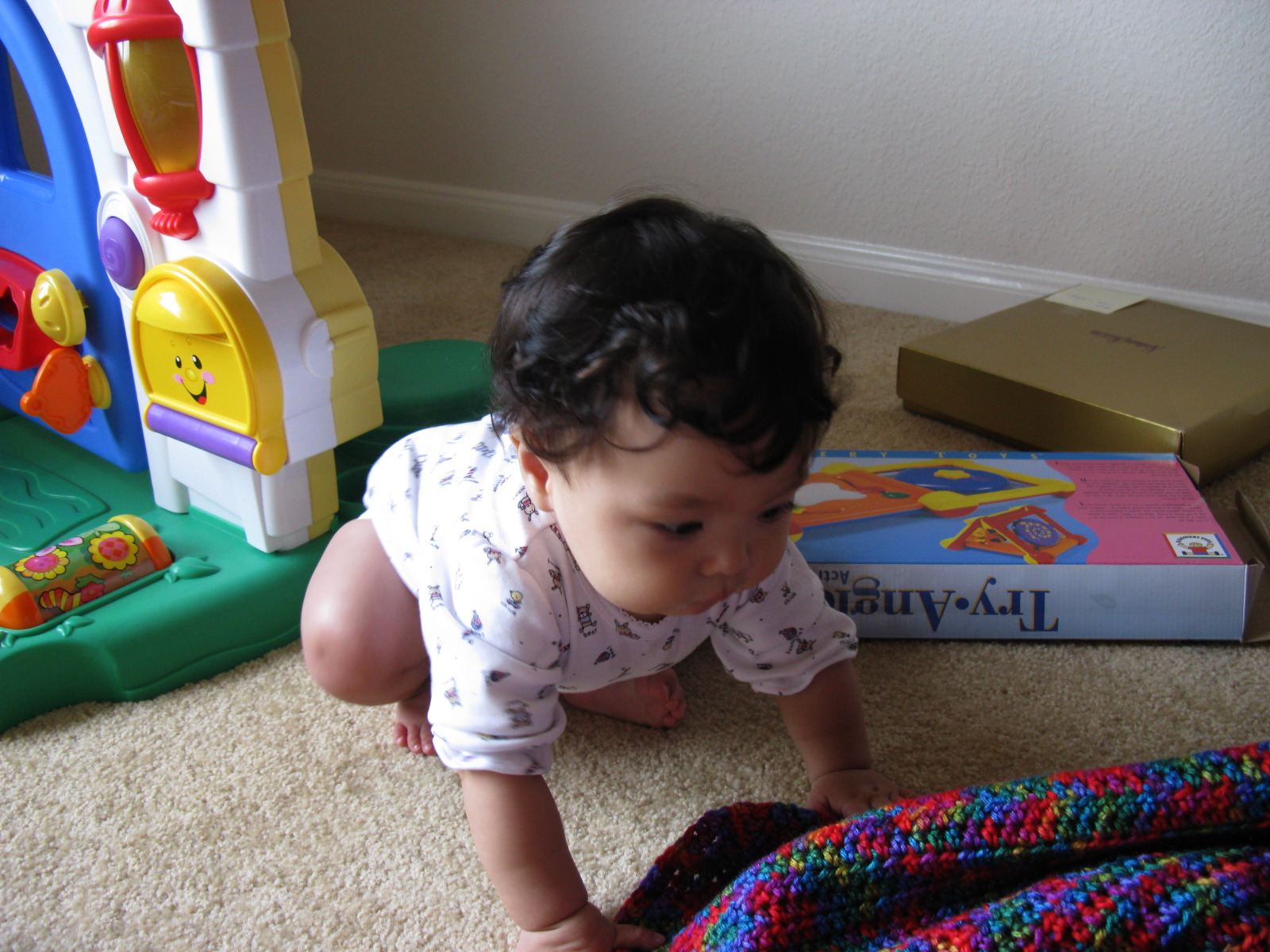 Dennis unwrapping her gift from Mommy. (Notice the afgan covering the toy in the corner)