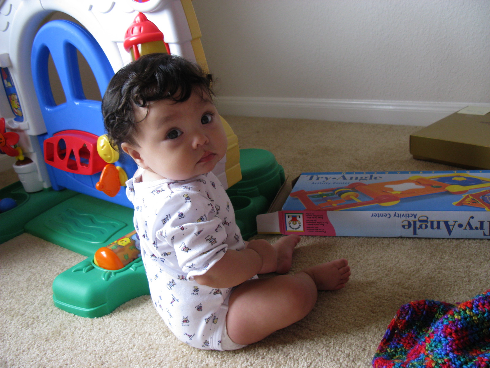 She's more interested in the afghan than the toy it was covering