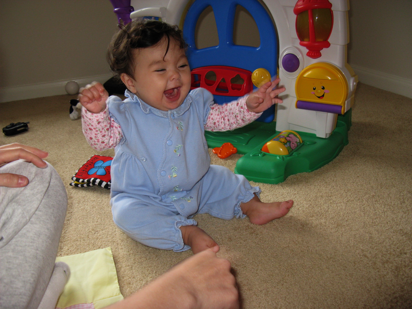 Dennis with a Red Ball in front of her Fisher Price laugh and learn home