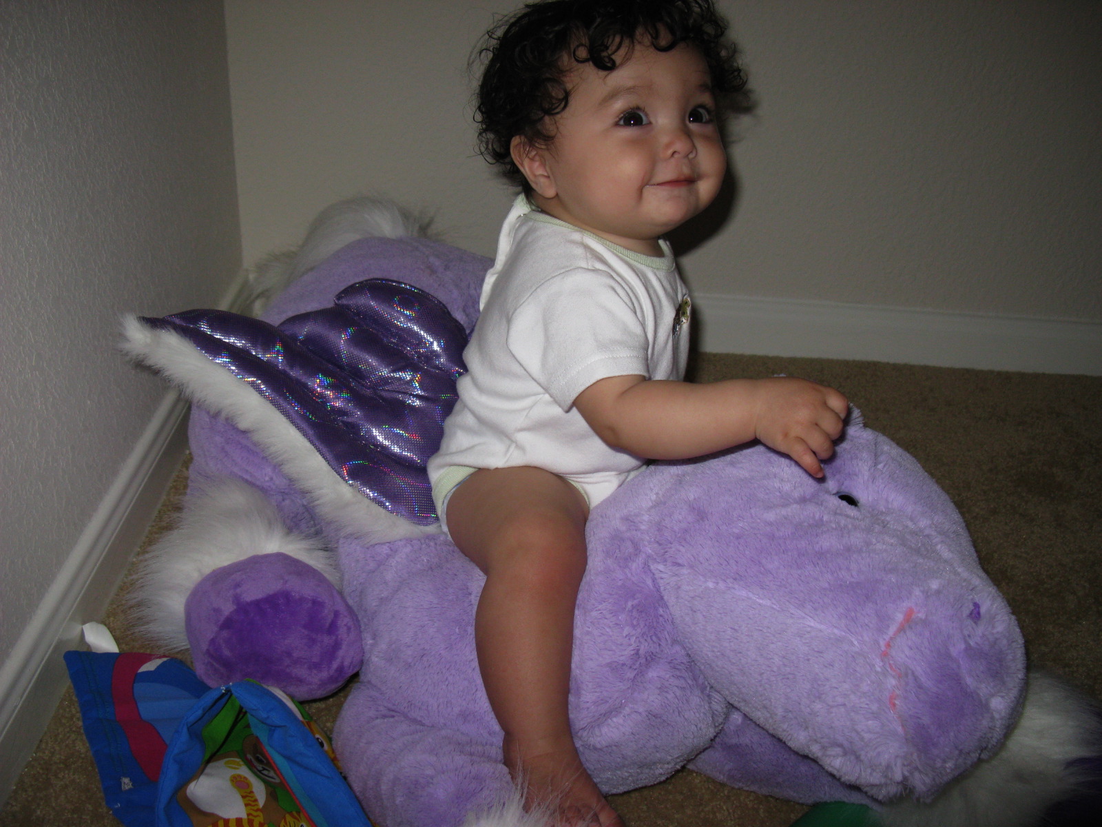 Dennis riding her purple pegasus stuffed animal