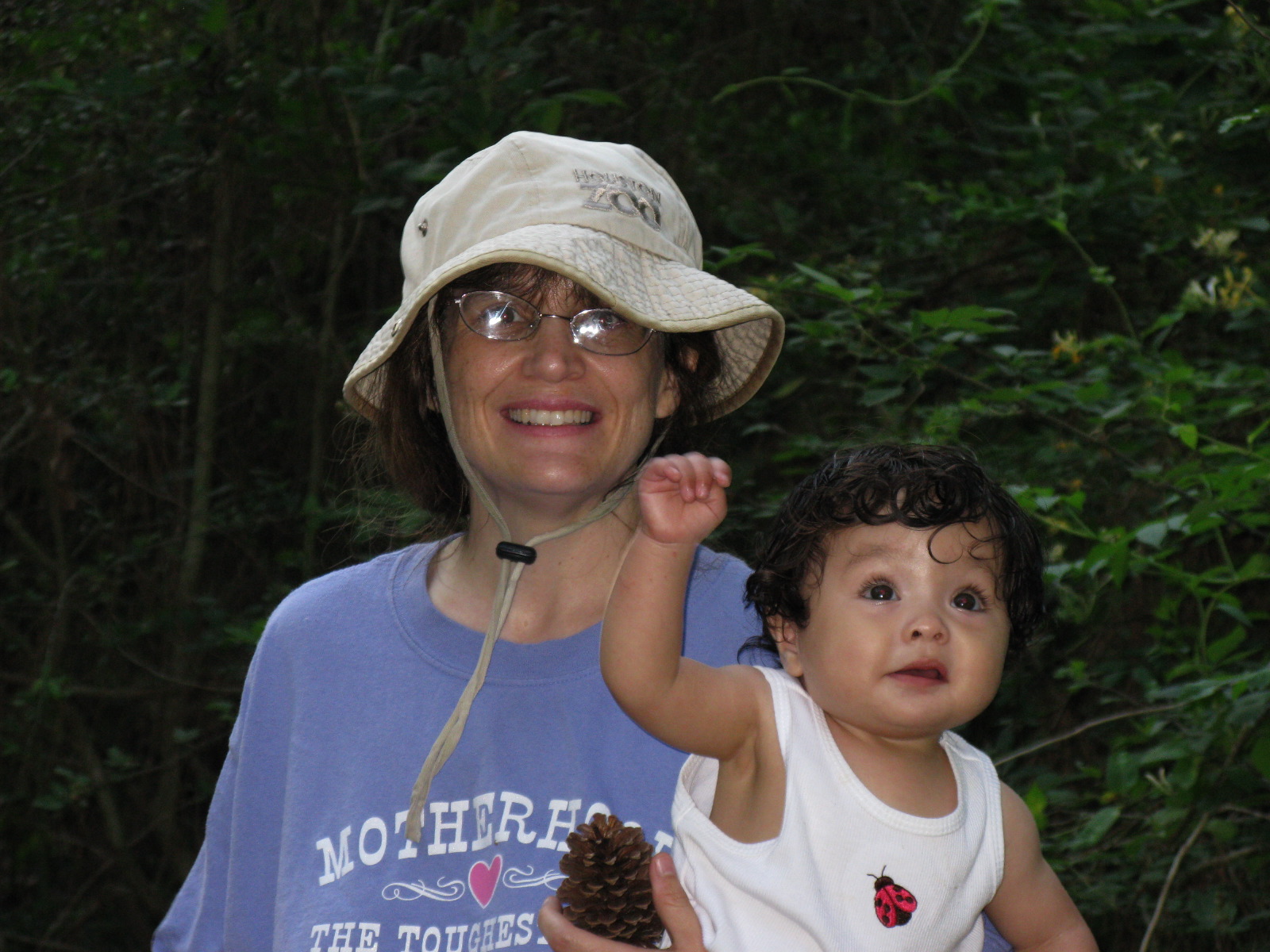 Mommy and Dennis holding Pine cones in Frankie Carter Randolph Park