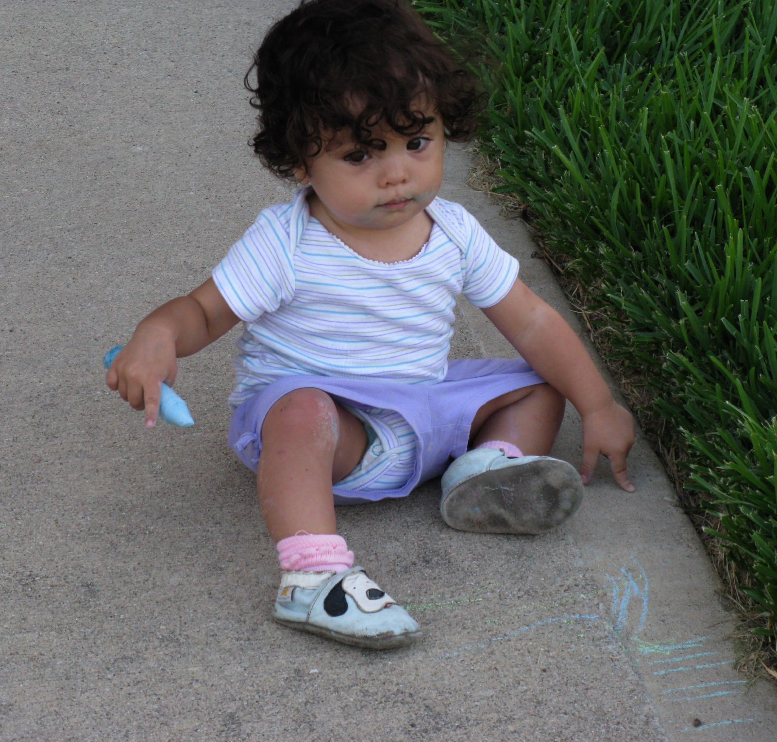 Mommy and Dennis coloring with chalk on the driveway